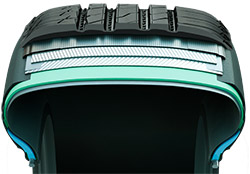 На стенках продольных канавок имеются круглые углубления, похожие на рисунок на мяче для гольфа, с помощью которых регулируется воздушные потоки в окружных каналах. Это предотвращает формирование громкого воющего звука. Применение такой конструкции позволило уменьшить уровень шума и повысить акустический комфорт при вождении.